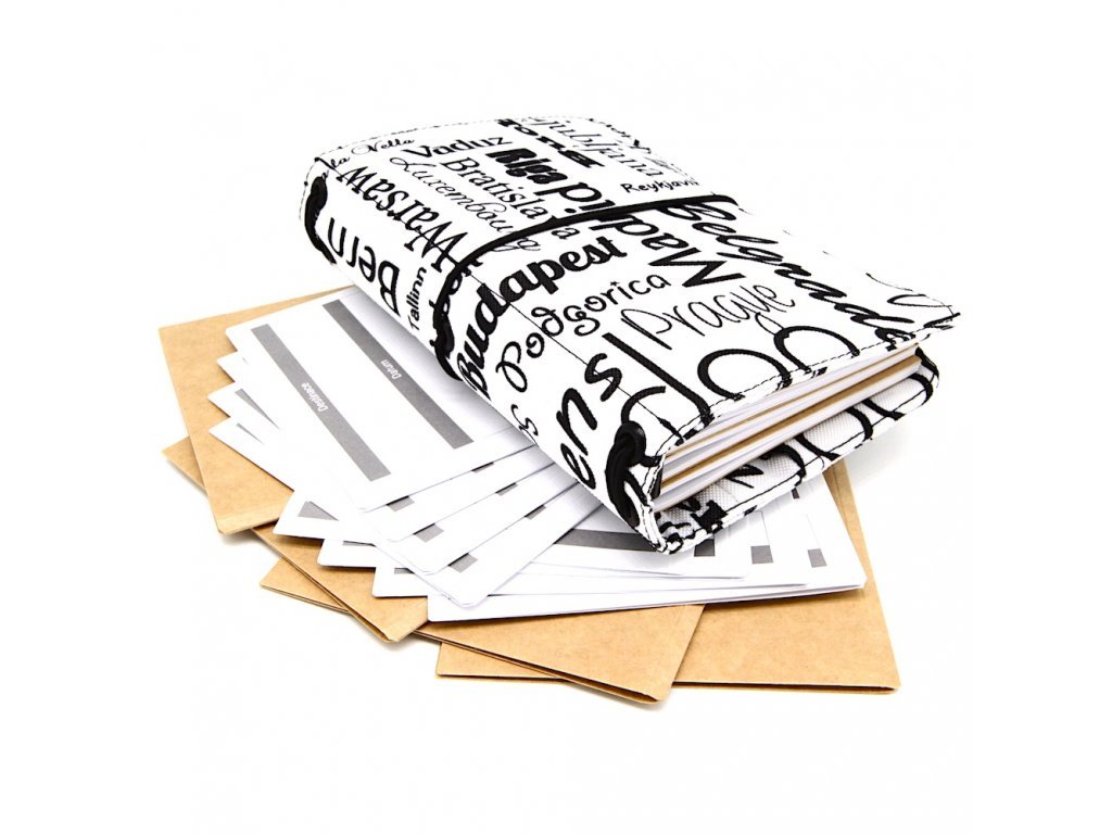 Praktické zakládací složky s výseky na vizitky, vstupenky a další dokumenty. Dva listy, složený formát: 100×150 mm; materál je stejný, jako u obálek zápisníků.