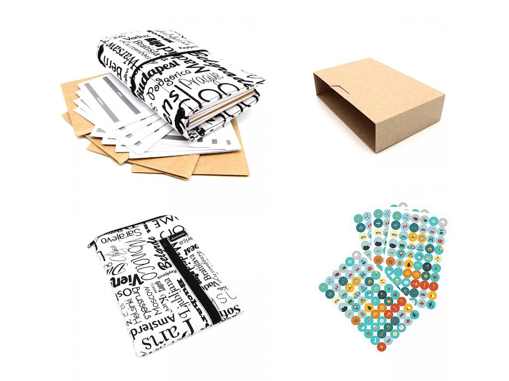 Pomocníci pro balení věcí a plánování cesty s předepsanými kategoriemi, systémem odškrtávání a volnými řádky na poznámky; potištění je oboustranné. Dva listy, složený formát: 100×150 mm; gramáž papíru: 300 g/m2.